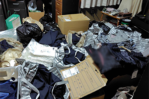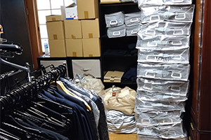 山のように積み上げられた在庫の服。