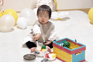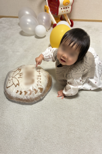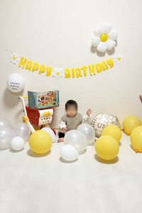 起きるのが待ち遠しくて部屋の中を見渡してみますとマミちゃんは前の日からあれこれ準備をしていたそうでバルーンだの一生餅の現代バージョンの大きなパンだの壁には布をかけてピンクのリボンが飾ってあり…